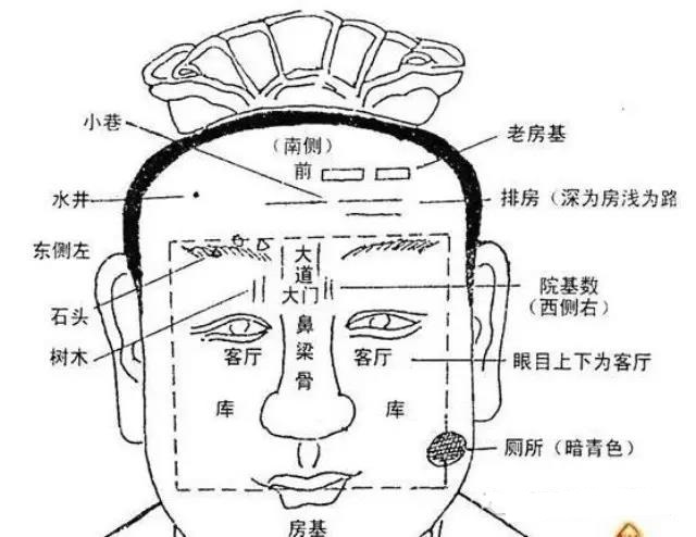 千人千相,人的整个脸面就是院子,额为院南(前),阁为院基为北(后),左为东,右为西,从眉至口的延长线可视为院内,余为院外,双眉间为大门,双眉间的竖纹数为院基数,竖纹一座院基,二道竖纹二座院基,粗纹表示院内房屋己修盖好了,细纹表示院内房屋尚未修盖好,或只有院基尚未建房。竖纹如有分叉,门楼修动过。眉间上面或下面有竖纹为树木,眉上有瀣纹为门外有树,眉下或鼻边有竖纹为院内有树,粗纹为大树,细纹为小树。眉间或眉上有三角或方块状为石头。额部有横纹,粗纹深纹为门前有排房,细纹浅纹为道路(纹线发亮者为路,发暗者为沟)额部有坑者,院中也有坑,或高低不平,若印堂上低,门口低,额为天,又可视为房上,可视为天花板,前额发黑,住宅天花板低,易有压抑感,反之则高,眉间青筋,人际关系不好。鼻为梁筑,鼻翼为库房,鼻子通天高耸,住房宽敞明亮,两侧鼻翼如丰满,房宅生财。另也可据鼻翼大小断家中财产多少,鼻中凹院中低,院内有树易患心脏病,人中为下水道,人中有痣,下水道堵塞或破裂,口为餐厅,口下为房基,脸上有青暗色者为厕所方位所在。院子有形状,高低长短宽窄不一样,脸长者,院子南北也长,男子寿命长,脸短者院小短,男子寿命短,地阁有坑,先绝是二房,母寿也短,左颧高男孩多,右颧高女孩多。左青龙右白虎,南朱雀,北玄武,部位要相应,阳宅主吉祥,甲字面有财不聚,山字面财源旺,国字面财运享通,申字面中年财运好,小巷道路对大门,财帛不旺人口损,大树对门,或把门对窗(指眼睛)主疾病财困,脸的周围莫要坑,若要有坑家必倾,三年祸事有二次,人口六畜有损伤。从面相上.看左边主父亲,右边主母亲,法令纹长短宽窄主家族大小,法令纹宽长家族人丁旺盛,反之则家中人丁不旺,法令纹左右等长对称者易任正房楼,大门为南北向,自己子女五官长的端正,法令纹左右等长不对称者,易住厢房楼,大门为东西向,自己子女五官长相或东大西小,或西大东小,有不对称之相。所以书笙建议:住宅要选正房居住为上。住宅除看眉毛,还要看承浆,眉毛整个浓而有型。院子房已修好,眉毛淡,院子尚未修好或住房尚未修好,承浆华美,光润吉利,必有祖宅。缺陷无祖宅,有痣弃祖宅,若有红丝纹痕,则祖宅被人分。(如从前资本家及地主子女均有此相)眉棱骨高,家中有人进过派出所,天仓低,钱总不够花,鱼尾有纹不论男女小心二次婚,上下齿中间凹下,家中必有凶死的人或残疾的人,其原因是住宅两头高中间低所刷。上下齿中间凸出,家中必有绝门的人,其原因是中间高两头低所制。玉梁骨高者,豕中必有顶门跳门或招亲人,嘴唇有眼子,家中必有服毒之人,鱼尾有竖纹伸向下方,家里必有凶死的人,男左女右,眼肚肿涨者亦然,人中数一线或有内包者,家中有养子。天庭饱满地阁窄,你得不上父亲的遗产(招亲或给人顶门)。下巴短者多婚姻不顺或再婚,以上绝招甚准不可妄传明哲自保。以上断阳宅之法。 二、怎样从手相上断阳宅几处,搬过几回家的相法密诀。 从手相断阳宅几处,请看手相乾宫部位,乾宫部有几条清晰横纹即有几处阳宅。那搬过几回家怎样断呢?人搬家多数是随着事业的变动而搬家的,所以此纹主要结合事业线来综合而断,手相搬家纹多即搬家的次数多 三、怎样从面相上断坟莹地好坏及几处的相法密诀看坟莹地那里看,山林琢墓发际边,白色光亮风水好,青筋暗陷有破变,得天地之气,则旺。得风水之气,则发。新旧风水管三代,爷爷积孙法为真,山管人丁,水管财,缺少一样受贫寒,看气色要远看,近看反而不准确。得风水之地气者骨肉起,塌陷者则失风水。即风水遭到破坏。有气发不休,无气发终败,曰月角有气额方圆,无气塌陷父母有难。眉若有气伏而秀,无鼻头气色为土质,三停一线仔细推,鼻为结穴处,鼻高坟在高处,如再有两颧拱起相护(即青龙白虎朝拱),口方而大地阁微起,即前有照有明水(江、河),坐案又扶朝,鼻再枯黄,土质干燥,色暗土质湿,有官有财也。从面相看风水当把鼻子视为结穴处,两颧为青龙白虎二山,两耳如照,则青龙白虎二山无破有力,两耳若耸,则此二山破矣,法令纹可视为沟路,嘴可视为河流,嘴方海润,天庭气润前方有江河之水(明水),嘴干地阁燥,可视前方之水为池塘之水(暗水),地阁偏上之纹可断;移过坟否(或坟莹地两处之符号),天庭处的山林纹为坟数纹,几纹便有几个坟,人中、鱼尾、额纹可断坟莹地的坐向(向口)。 四、怎样从面相上断坟莹地向口方位的相法密诀 (1)断坟莹地向口不是千篇一律的,因人有千相,千相干面,千面千纹。从三点而论:即人中、鱼气粗反兄弟疏情。人中有气则深长,无气平平得子孙很难。新旧风水上下看,额、鼻、人中、地阁参,得风水之气后代旺,色、恶、暗滞后代衰,死后寄存没下葬,子孙无力,易颧骨暗滞青筋缠。鼻头气色为土质,三停一线仔细推,鼻为结穴处,鼻高坟在高处,如再有两颧拱起相护(即青龙白虎朝拱),口方而大地阁微起,即前有照有明水(江、河),坐案又扶朝,鼻再枯黄,土质干燥,色暗土质湿,有官有财也。从面相看风水当把鼻子视为结穴处,两颧为青龙白虎二山,两耳如照,则青龙白虎二山无破有力,两耳若耸,则此二山破矣,法令纹可视为沟路,嘴可视为河流,嘴方海润,天庭气润前方有江河之水(明水),嘴干地阁燥,可视前方之水为池塘之水(暗水),地阁偏上之纹可断;移过坟否(或坟莹地两处之符号),天庭处的山林纹为坟数纹,几纹便有几个坟,